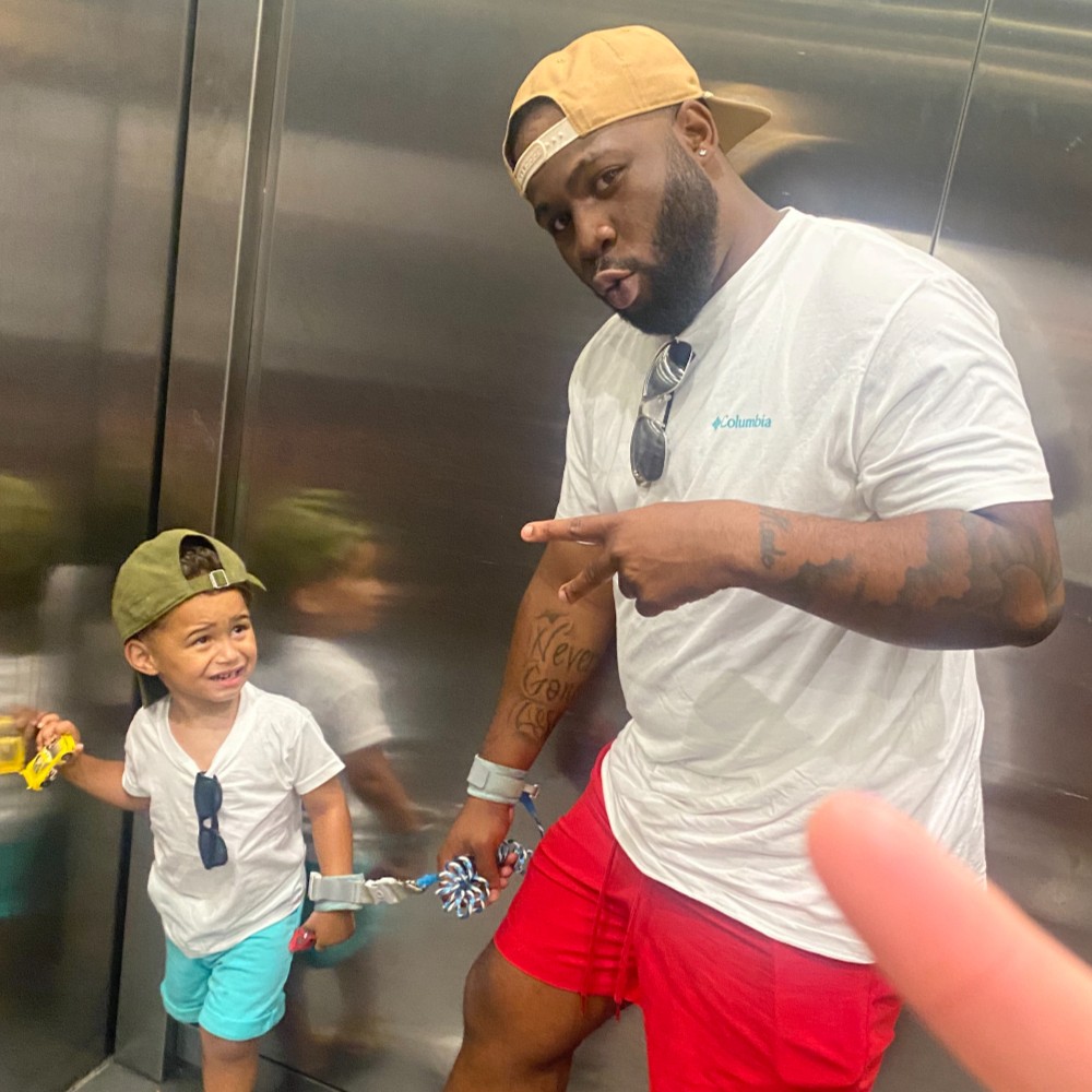 Me and my son Malik II mocking each other in the elevator.